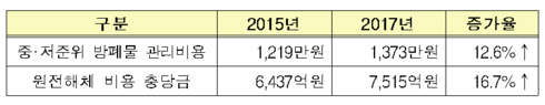 중‧저준위 방폐물 관리비용과 원전해체 비용 충당금 비교