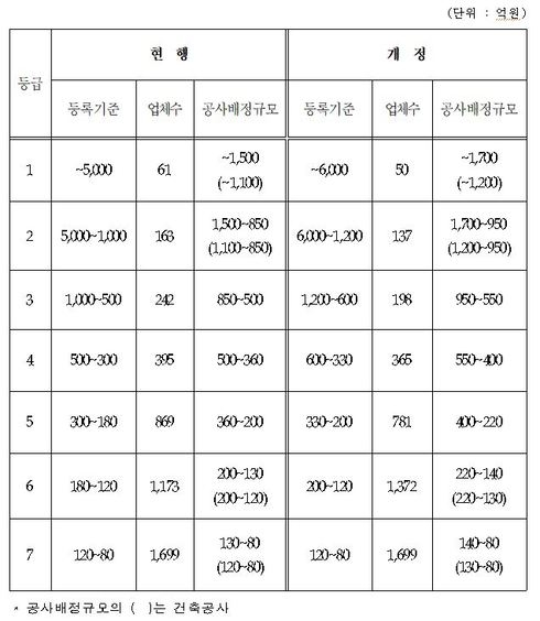 주요 개정내용으로는 ▲1등급의 등록기준 상향 및 공사 배정규모 축소, ▲2등급 이하 등록기준 및 공사 배정규모 조정이다.