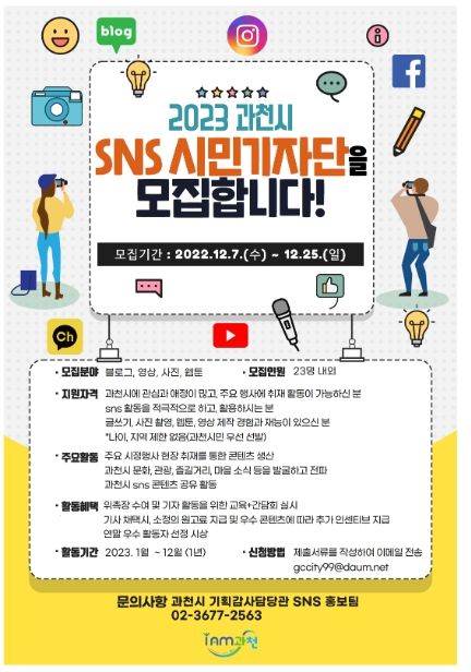 (비전21뉴스) 과천시는 시민의 눈높이에 맞는 생생한 시정소식을 전달할 ‘2023 과천시 SNS시민기자단’을 오는 25일까지 공개 모집한다.