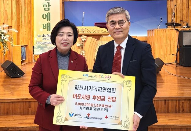 (비전21뉴스) 10일 과천시에 따르면, 과천시기독교연합회는 부활절(4월 9일)을 맞아 과천약수교회 예배당에서 열린 부활절 연합예배 자리에서 지역 내 도움이 필요한 주민을 위해 써달라며 과천시에 지역화폐 5백만원을 기부했다.