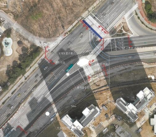 다만, 횡단보도가 설치되어도 도로 여건상 한 번에 건널 수는 없으며, 차량 신호와 연계하여 2~3회에 걸쳐 본도심으로 이동할 수 있게 된다.