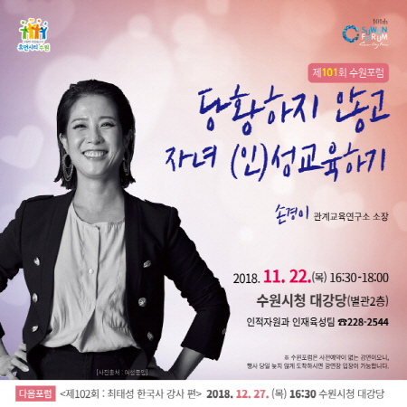이번 달 수원포럼에서는 자녀를 위한 부모의 성교육 방법 사례를 통해 흥미롭게 풀어나갈 예정이다. 손경이 소장은 ‘적절한 성교육의 시기는 언제인가요?’, ‘큰아이가 9살인데, 성에 대해 어디까지 교육해야 할지 모르겠어요’, ‘성에 대한 관심이 폭발하는 자녀들의 질문에 대답하기가 곤란해요’ 등 부모가 느낄 고충에 대한 현명한 교육법을 소개한다.