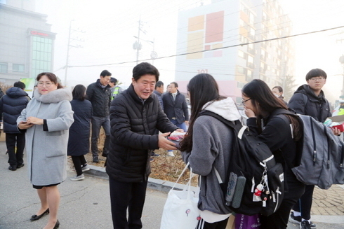 김광철 연천군수는 응원용 물품을 제공하며 “수험생들이 수능대박을 기원하며 아침 일찍 격려하러 나와 주신 군의원님을 비롯한 학부모 선후배 여러분께 감사드린다.”며 “노력한 만큼 결과가 나올 수 있도록 긴장하지 말고 최선을 다하길 바란다.”고 수험생을 격려했다.