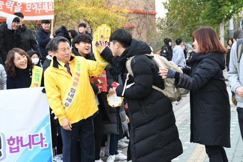 | 구리시 구리고등학교에서 고사장에 들어가는 수험생들을 응원하는 안승남 구리시장 | |