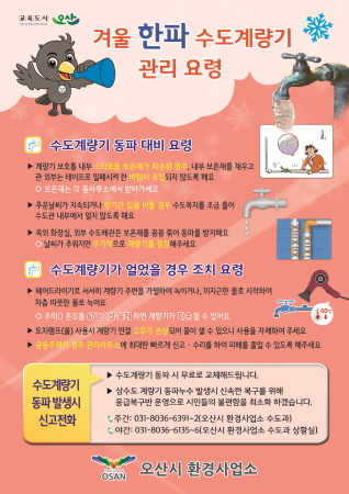 시는 수도계량기 동파로 인한 시민의 불편을 최소화하기 위해서 기간 동안 관내 6개 상수도 대행업체를 비상대기 시키고 수도계량기 동파 시 무료로 계량기를 교체하여 줄 계획이며, 동파 발생 시 주간에는 환경사업소 수도과, 야간에는 수도과 상황실로 신고하면 신속한 조치를 받을 수 있다.