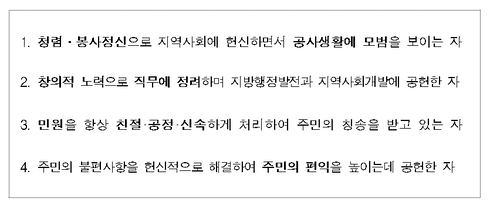 저소득 독거노인 직접방문을 통한 우울증 테스트, 횡성한우 수출을 통한 세계화, 매년 8천여명의 만성퇴행성 질환자 물리치료 등 지역발전과 주민서비스 향상을 위해 헌신하면서 귀감이 된 지방공무원 9명이 선정됐다.