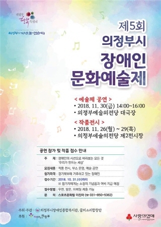 지역사회의 장애인과 비장애인이 함께 문화예술분야의 밝은 미래를 향해 나아가고자 열리는 의정부시장애인문화예술제는 작품 전시회, 예술제 공연, 체험부스로 운영된다. 작품 전시회에서는 서예, 동양화, 서양화, 원예, 프리저브드 플라워 등 약100여 점 이상의 다양한 장르의 작품들을 감상할 수 있으며, 예술제 공연에서는 악기, 합창, 기타, 댄스, 난타, 합주 등의 장르로 구성되어 전문분야와 아마추어분야에서 활동하는 장애예술인의 노력과 열정을 느끼는 현장이 될 것이다.