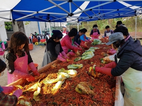 지난 9월 새마을협의회·부녀회가 직접 배추모종을 심어 재배한 배추와 ㈜형제축산물백화점 김민균 사장이 기부한 돼지고기 10kg로 김장김치 400포기와 수육을 준비했다.