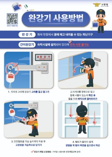유경환 화재예방과장은 “완강기는 화재 시 생명을 지키는 중요한 피난기구로, 평소 사용법을 숙지해 위급 상황에서 침착하게 사용할 수 있어야 한다.”라며, “특히 다중이용시설 및 고층건축에서는 정기적으로 교육과 훈련을 통해 실질적인 대비가 중요하다”라고 강조했다.