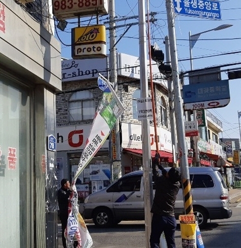이날 일제정비는 불법현수막을 제거 한 뒤 잔재물이 흉물스럽게 남아있어 도시미관을 저해하고 시민불편을 주고 있어 이뤄졌으며 건축과 광고물팀 및 경기도옥외광고협회 김포시지부 회원 등 10여명이 참여해 대곶면 구시가지 일대의 가로등, 전신주 등에 지저분하게 남아있는 노끈, 철사, 벽보 등을 말끔히 제거했다.