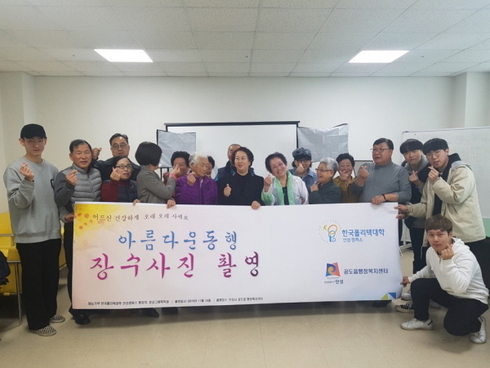김진관 공도읍장은 “학장님을 비롯하여 교직원들과 영상그래픽과 교수님과 학생들이 나눔의 마음으로 어르신 한분 한분 정성되이 장수사진을 촬영해 주셔서 감사하다”며“앞으로도 주민의 복지를 위하여 지역사회복지의 중추적 역할을 수행하며 나눔과 사랑이 넘치는 공도읍 되도록 노력할 것이다”라고 전했다.