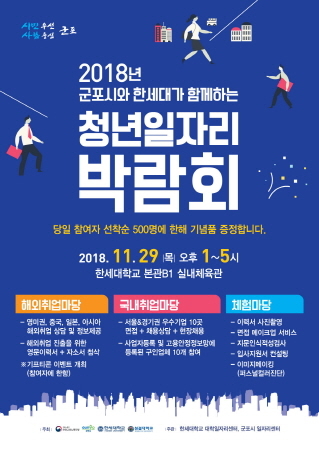 이날 행사장에는 영미권, 중국, 일본 등의 취업 정보를 제공할 해외취업마당, 서울과 경기권 우수기업 10곳과의 면접 및 채용 상담이 이뤄질 국내취업마당, 이력서 사진 촬영과 입사지원서 컨설팅 등이 시행될 체험마당이 마련된다고 시는 설명했다.