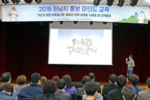 이번 교육은 청정하남 소식지, 하남뉴스, 문자서비스, G버스 TV활용, SNS 등의 우리시 홍보채널에 대한 소개를 시작으로, ㈜우아한형제들의 이현재 이사를 초빙. 강의를 진행했다.