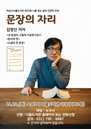 이번 강연은 국내 최고 단행본 교정·교열전문가 김정선 저자이다. 1993년"한국인"의 편집부에서 교정지와의 인연으로 시작한 이후 2000년부터는 외주 교정자로 문학과지성사, 생각의 나무, 한겨레출판, 현암사, 시사IN북 등의 출판사에서 교정 교열 일을 해 왔다. 주요 저서로는 동사의 맛, 내 문장이 그렇게 이상한가요?, 소설의 첫 문장 등을 출간했다.