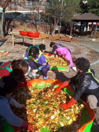 행사 첫째 날에는 자원봉사단원들이 율현동 주민이 기부한 배추를 비롯하여 각종 채소들을 다듬어 김장 재료 준비를 하고, 둘째 날에는 절인 배추에 양념을 버무려 김장김치를 만들어 용기에 담아 42가정에게 배달했다.