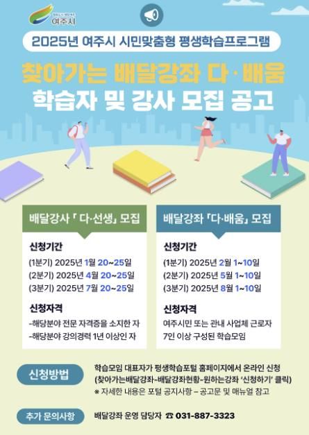 (비전21뉴스=최주철 기자) 여주시 평생교육과에서는 평생학습 사각지대 주민의 학습권 기회 보장과 시·공간 제약 없는 시민 맞춤형 평생학습 프로그램을 제공하고자 “찾아가는 배달강좌 '다·배움' 학습자 및 배달강사 '다·선생'” 을 모집한다.