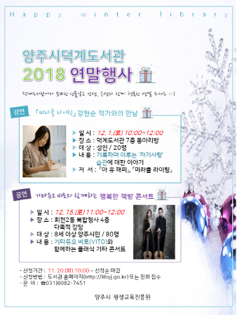 도서관 관계자는 “행복한 연말을 보내실 수 있도록 뜻깊은 강연과 공연을 준비했다”며 많은 관심과 참여를 바란다고 말했다.