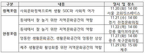 1회는 ‘사회문화정책으로서의 생활 사회간접자본과 사회적 여가’를 주제로 20일 오후 2시 서울 코워킹스페이스에서, 2회는 ‘동네에서 잘 놀기 위한 지역문화공간의 역할’을 주제로 21일 오후 2시 경기도 진접문화의집에서, 3회는 2회와 같은 주제로 11월 22일 오후 2시 강릉시 웨이브라운지에서, 4회는 ‘엉뚱한 생활문화공간, 생활문화공간의 엉뚱한 상상’을 주제로 27일 오후 2시 광주광역시 북구문화의집에서, 5회는 ‘제주 생활문화 활성화를 위한 지역문화공간의 역할’을 주제로 29일 오후 3시 제주에서 열린다.