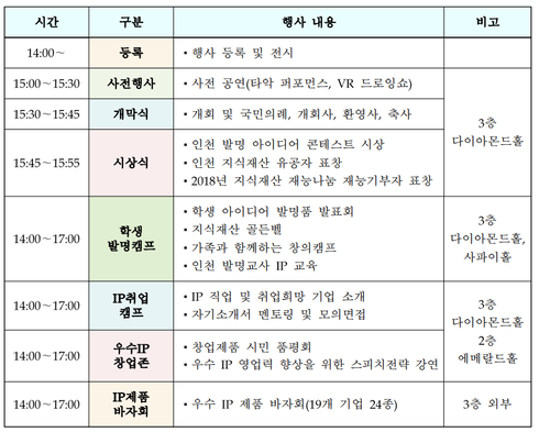 한편, 이번 행사에서는 인천의 지식재산 창출·활용·보호에 공헌한 지식재산 유공자를 표창하고, ‘인천 발명 아이디어 콘테스트’에서 뛰어난 발명아이디어로 입상한 수상자를 격려하는 시상식도 마련된다.