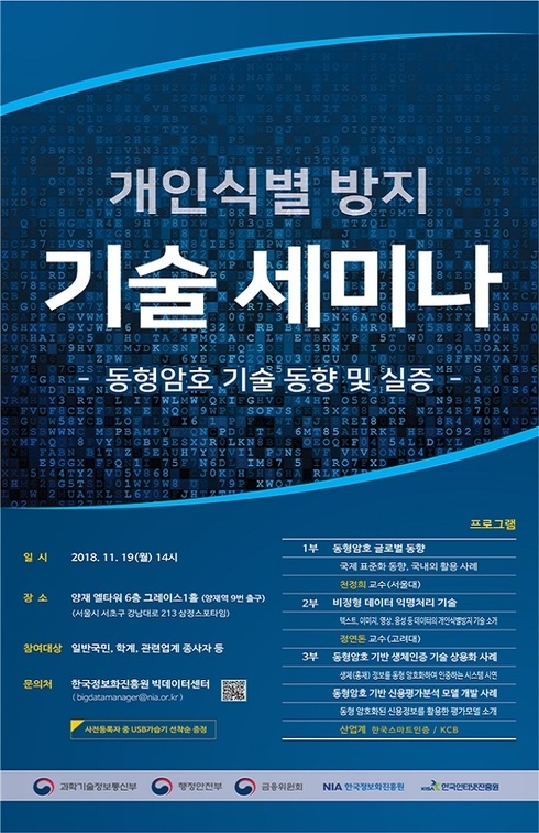 과기정통부, 행정안전부, 금융위원회가 공동 주최하고 한국정보화진흥원과 한국인터넷진흥원이 주관한 이번 행사는 누구나 쉽게 이해할 수 있도록 동형암호 글로벌 동향 및 비정형 데이터 익명화 기술을 소개하고 생체인증 및 신용평가 활용 사례 발표 및 시연 등으로 구성했다.