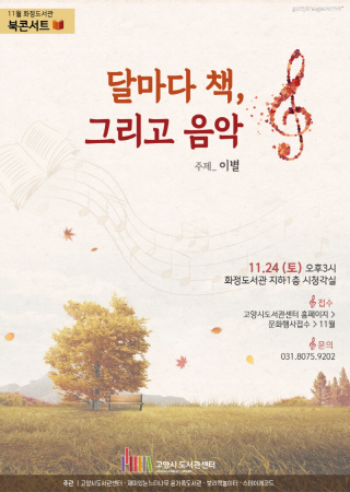 11월 북콘서트는 ‘이별’을 주제로 한다. 기타, 피아노, 노래, 국악 등 음악과 더불어 책을 낭독하고 관객과 소통하는 시간을 가질 예정이다. 이날 사회는 ‘재미있는 느티나무 온가족도서관’ 이승희 관장이 맡는다. 그룹 ‘포레스트’의 음악이 북콘서트를 더욱 알차게 채워줄 예정이다.
