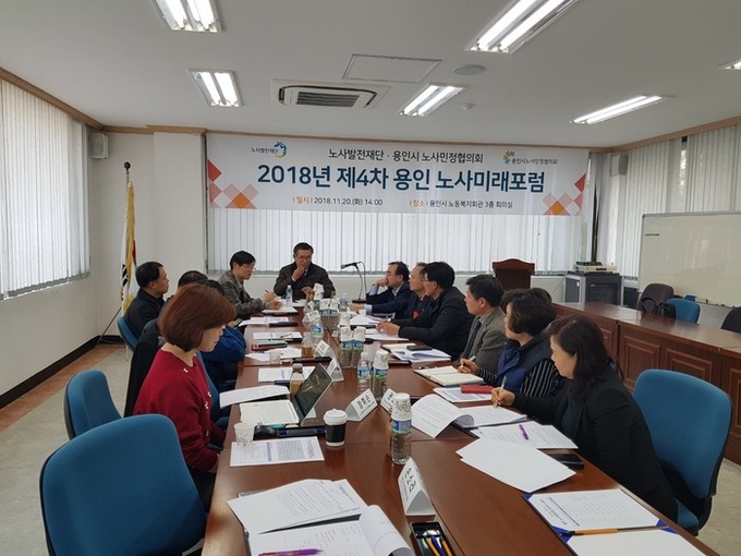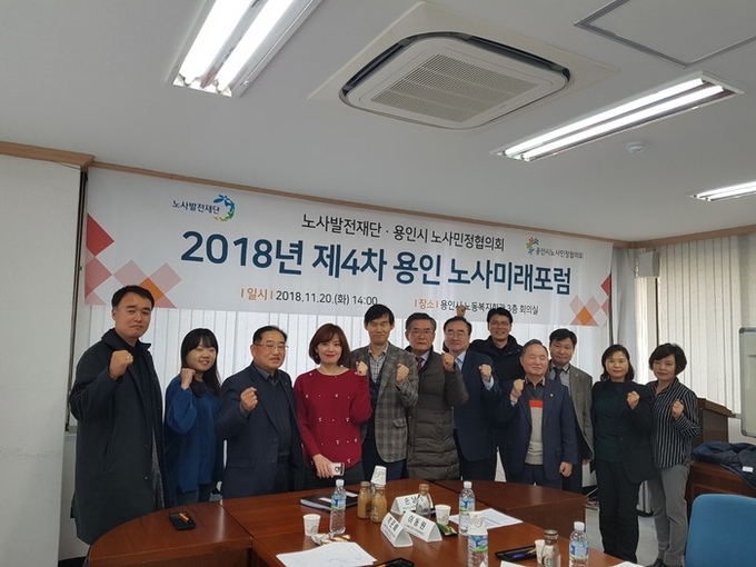 용인시노사민정협의회(위원장 백군기)가 노사발전재단(사무총장 이정식)과 함께 11월 20일 오후2시 용인시노동복지회관에서 한국노총비정규직연대회의, (사)용인시아파트연합회, ㈜대민환경, 한국전기기술인협회 등지역 노사민정 관계자 14명이 참석한 가운데 「용인 노사미래포럼」을개최했다.