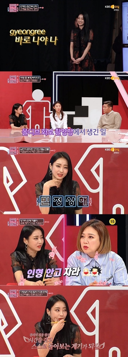 어제 방송된 KBS Joy 로맨스파괴 토크쇼 ‘연애의 참견 시즌 2’ 14회에서는 분노와 애틋함을 넘나드는 다채로운 참견 토론이 펼쳐졌다. 특히 시즌 2 첫 게스트로 참여한 경리는 프로 참견러들과 어우러지며 당찬 매력을 뽐냈다.