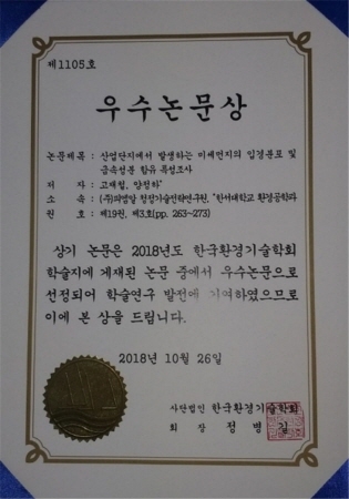 최근 고농도 미세먼지 발생으로 미세먼지에 대한 국민적 관심이 집중되고 있다. 이에 따라 시 환경정책과 공단환경관리팀에서는 2017년 시흥녹색환경지원센터 연구개발과제로 ‘시흥스마트허브 대기 중 중금속 물질거동 및 관리대책 방안 수립’을 제안하고, 시 관내 환경업체인 ㈜피엠알에서 수행했다. 그 결과를 토대로 작성된 논문이 지난 10월 26일 목포대에서 열린 한국환경기술학회 정기총회에서 한국환경기술학회 우수논문상을 수상했다.