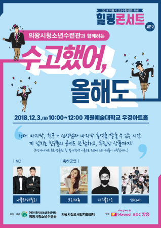 이번 콘서트에서는 관내 고등학교 학생들이 끼와 열정을 마음껏 펼칠 수 있는 학교대항 재능 콘테스트를 시작으로 선생님, 친구들의 영상메시지와 관내 고등학교 3학년 친구들의 사진으로 만든 뮤직비디오를 상영할 예정이다. 또한‘나몰라패밀리’가 MC로 나서고 축하공연으로 ‘크리샤츄’,‘매드클라운’,‘TRCNG’등 인기가수들이 참여해 멋진 음악으로 콘서트의 대미를 장식할 예정이다.