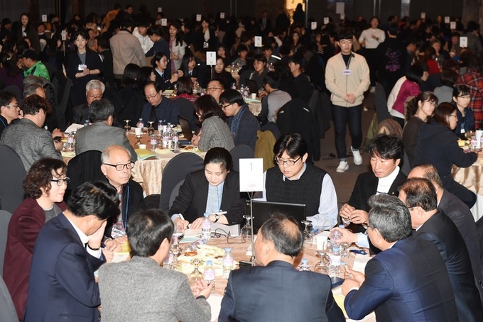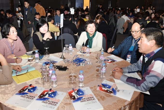 ‘평화와 통일로 가는 여정, 수원시민과 함께’을 주제로 열린 이날 원탁토론에는 청소년, 어르신 등 다양한 연령대 시민 300여 명이 30개 원탁에 나눠 앉아 ‘수원형 남북교류협력사업’을 의제로 토론했다. 토론 참여자는 사전에 모집했다. 토론에 앞서 정세현 전 통일부 장관이 강연했다.