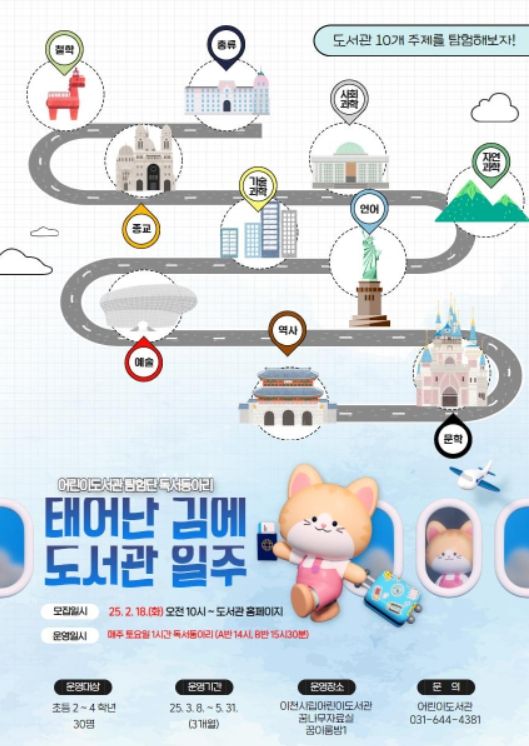 (비전21뉴스) 이천시 어린이도서관은 2025년 3월 8일부터 초등학생 어린이 대상 독서 챌린지 ‘태어난 김에 도서관 일주’를 운영한다고 밝혔다.