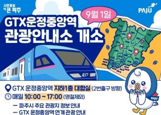 (비전21뉴스) 파주시는 9월 1일 지티엑스(GTX) 운정중앙역에 신규 관광안내소를 개소하고 본격적인 운영에 들어갔다고 밝혔다.