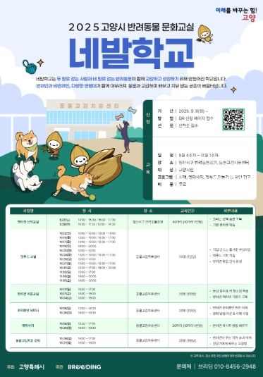 (비전21뉴스) 고양특례시는 반려동물과의 건강한 공존 문화를 조성하고 시민들의 반려동물 관련 지식을 증진하기 위해‘2025년 고양시 반려동물 문화교실’강좌별 수강생을 모집한다고 9일 밝혔다.
