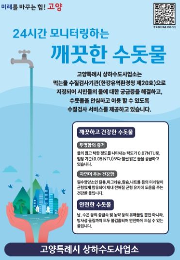 상하수도사업소 관계자는 "이번 캠페인을 통해 고양시 수돗물에 대한 궁금증이 해소되고 시민들의 신뢰도가 크게 향상되길 바란다”며 "앞으로도 다양한 현장 홍보활동을 통해 안전하고 깨끗한 수돗물 음용 문화 정착에 최선을 다하겠다”고 말했다.