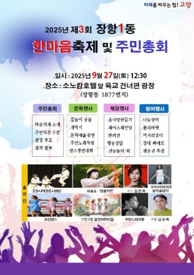 (비전21뉴스) 고양특례시 일산동구 장항1동 주민자치회는 오는 27일, 고양 소노캄호텔과 빛마루 방송지원센터 사이 광장(장항동 1877번지)에서 ‘2025년 장항1동 한마음축제·주민총회’를 개최한다고 밝혔다.