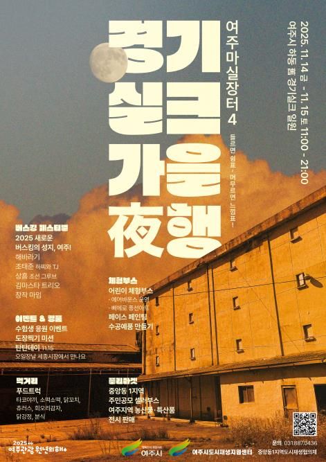 (비전21뉴스) 여주시는 오는 11월 14일부터 15일까지 이틀간 여주 경기실크 일원(여주시 하동 123-6번지)에서 '여주마실장터4 가을야행'을 개최한다고 밝혔다. 이번 행사는 '2025 새로운 버스킹의 성지, 여주!'라는 슬로건 아래, 깊어가는 가을밤의 정취를 더할 버스킹 페스티벌과 함께 다채로운 마켓과 체험을 선보일 예정이다.