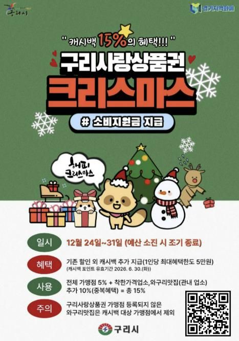 (비전21뉴스) 구리시는 12월 24일부터 ‘구리사랑상품권 크리스마스 소비 지원금’을 지급한다고 밝혔다. 이번 소비 지원금은 연말연시 기간 지역 외로 유출되는 소비를 지역 내로 유도하고, 관내 상권 활성화와 소상공인 보호를 위해 마련됐으며, 예산 소진 시 조기 종료될 수 있다.