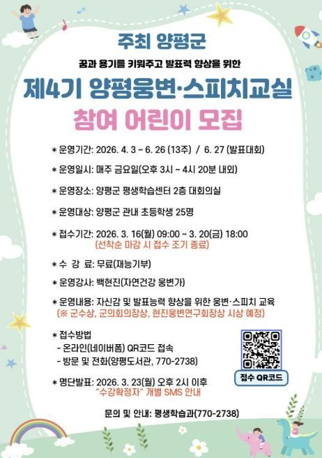 ‘제4기 양평웅변·스피치교실’ 참여 접수 기간은 3월 16일 오전 9시부터 3월 20일 오후 6시까지이며, 희망자는 홍보문에 있는 정보 무늬(QR 코드)를 통해 온라인으로 신청할 수 있다.