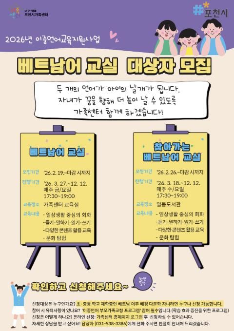 (비전21뉴스) 포천시 직영 ‘더 큰 행복 포천시가족센터’는 다문화 자녀의 이중언어 역량 강화를 위한 2026년 이중언어 교육지원사업 베트남 교실 수강생을 모집한다.