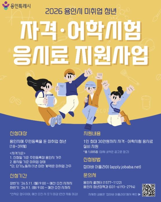 (비전21뉴스) 용인특례시는 취업을 위해 어학과 자격증 시험 등을 준비 중인 청년을 위해 응시료 30만 원을 지원한다고 30일 밝혔다.