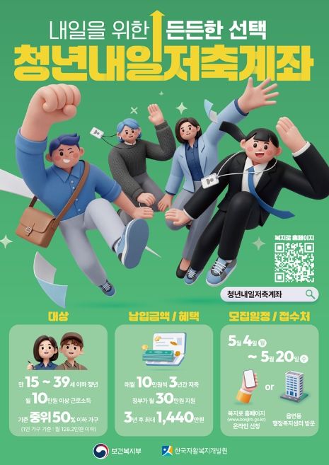 청년내일저축계좌는 근로 활동을 하는 청년이 매월 10만 원씩 저축하면, 정부가 매월 30만 원의 지원금을 적립해 주는 자산형성지원 사업이다. 올해는 기준 중위소득 50% 이하 청년을 대상으로 지원이 이뤄지며, 해당 기준에 해당하는 경우 별도의 수급자 여부와 관계없이 신청할 수 있다.