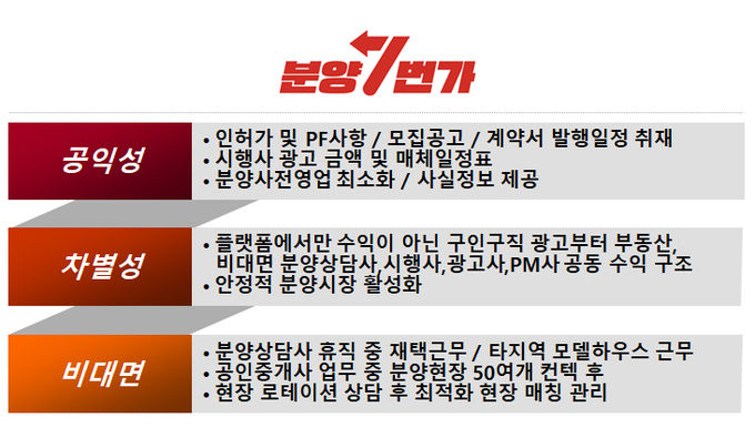 분양7번가는 시행사 및 시공사, 분양대행사, 분양상담사, PM사, 종합광고사 등을 매칭시켜 줌으로써 보다 나은 분양 관련사업의 발판을 제공하는 역할을 추진할 계획이다.