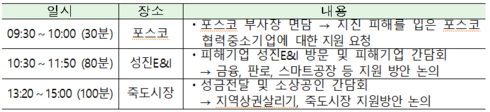 홍종학 장관은 먼저 이번 지진으로 피해를 입은 중소기업에 포스코, 현대제철, 롯데건설 등 대기업 협력기업이 다수 포함된 것을 확인하고 직접 포스코를 방문해 부사장을 면담하고, 피해협력기업에 대한 납품기한 연장 등을 요청하고, 지역경제 활성화를 위한 포스코의 노력을 당부했다.