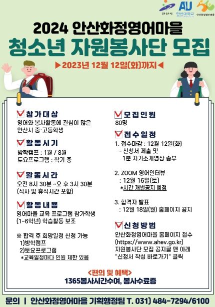 (비전21뉴스=최주철 기자) 안산시 화정영어마을은 관내 중·고등학생을 대상으로 ‘2024년 안산화정영어마을 청소년 자원봉사단’을 모집한다고 5일 밝혔다.