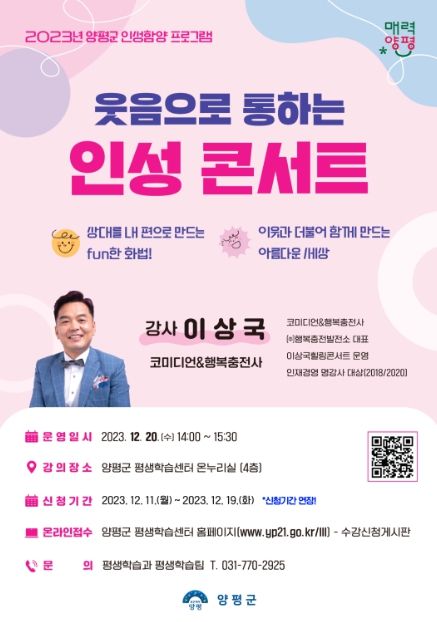 (비전21뉴스) 양평군은 인성함양 프로그램 ‘웃음으로 통하는 인성 콘서트’를 오는 20일 14시 평생학습센터 4층 온누리실에서 개최한다고 밝혔다.