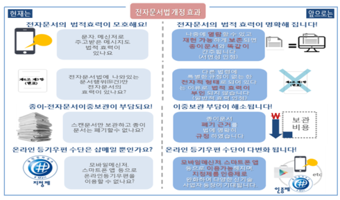 이에 따라, 1,400여개 법령에서 요구하는 각종 서면, 문서, 서류 등을 전자문서로도 작성, 보관, 제출할 수 있는 명확한 근거가 마련돼 사회 전반의 전자문서 이용 활성화가 기대된다.