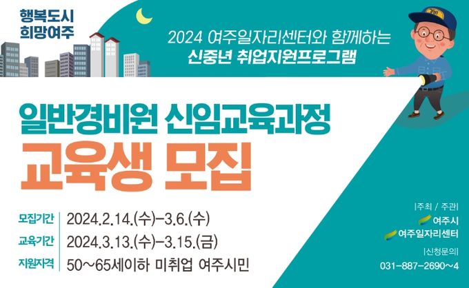 (비전21뉴스) 여주시는 2월 14일부터 3월 6일까지 여주일자리센터에서 신중년(베이비부머)취업지원을 위한 2024 일반경비원 신임교육과정 교육생을 모집한다고 밝혔다.
