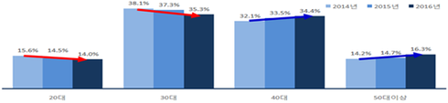 40·50대 이상 산업기술인력 비중은 상승한 반면에 20·30대 비중은 하락 추세가 지속돼 산업기술인력의 고령화가 확대되는 추세로 나타났다.