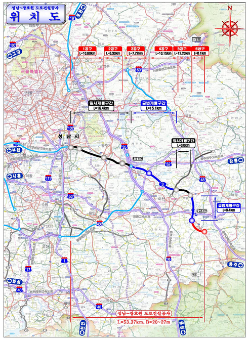 총 사업비 1조 5,735억 원이 투입돼 전체 47km 구간을 4∼6차선으로 건설된 이 도로는 지난 2002년부터 순차적으로 착공한 후 기존국도의 만성적인 정체구간 해소와 광주∼원주, 안양∼성남 간 민자고속도로 교통망 연계를 위해 지난해와 올해 추석 연휴 기간 중 25km를 우선 개통한 바 있다.