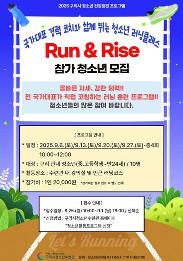 ‘청소년 러닝클래스 Run & Rise’는 구리시 중·고등학생부터 만 24세 이하 청소년을 대상으로, 9월 6일부터 27일까지 매주 토요일 총 4회에 걸쳐 청소년들이 올바른 운동 습관을 기르고 러닝을 통해 도전과 성취의 기회를 경험하는 기회를 선사한다.